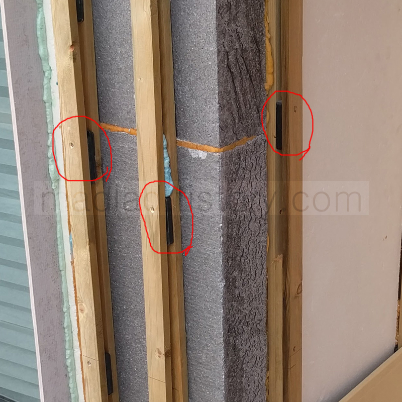골조에 단열재를 접착하고 그 위에 긴 앙카를 이용하여 각재를 고정해준 후에 시멘트 사이딩을 각재에 고정하여 마감을 완성하는 방법입니다.